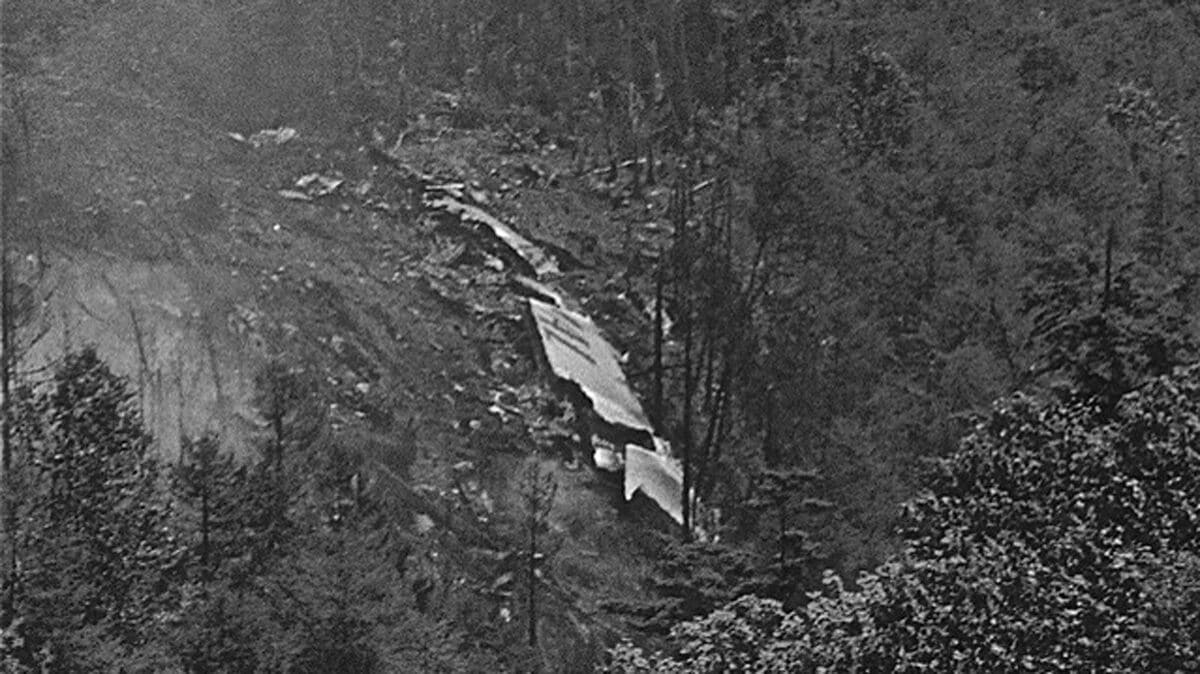 機体は傾いたまま右主翼の先端が稜線に激突し、衝撃で右主翼の先端とわずかに残る垂直尾翼と水平尾翼、第1・第2・第3エンジンが脱落。