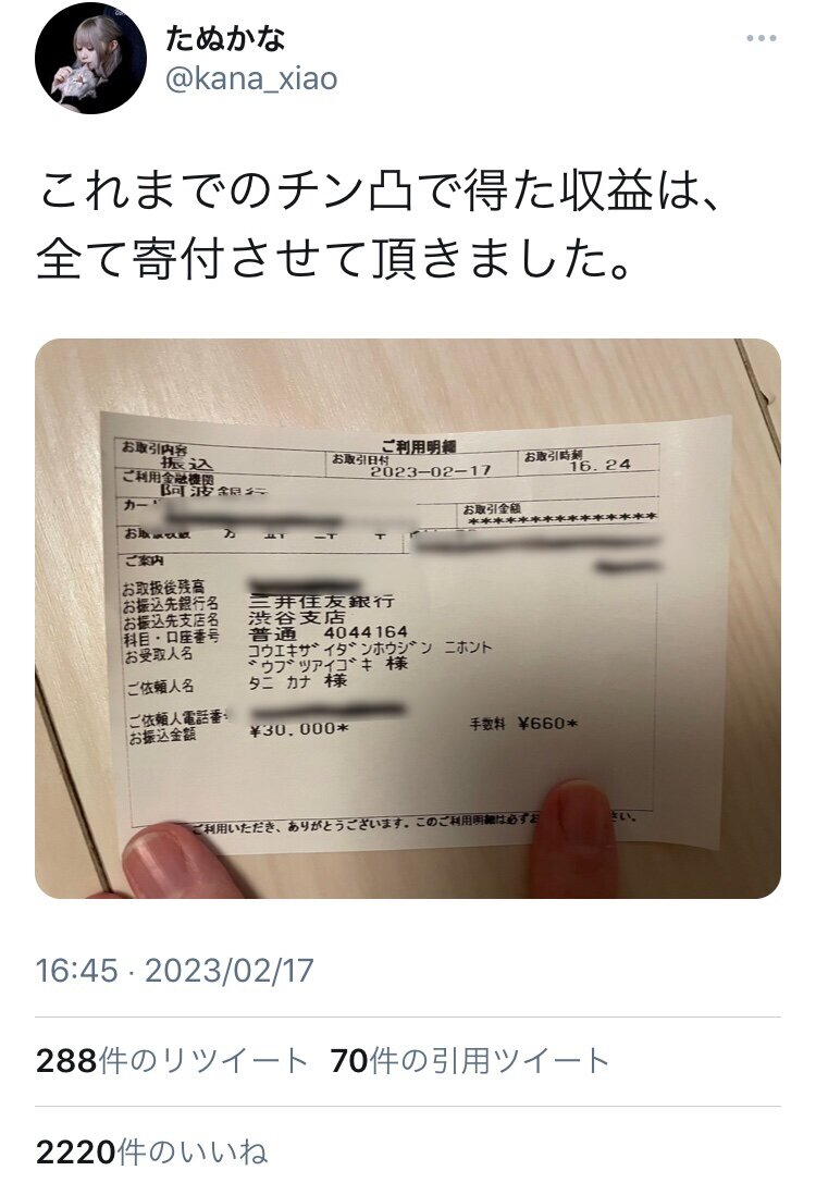 引用元: 【画像】たぬかなさん、復帰後ホビられた収益を全額寄付