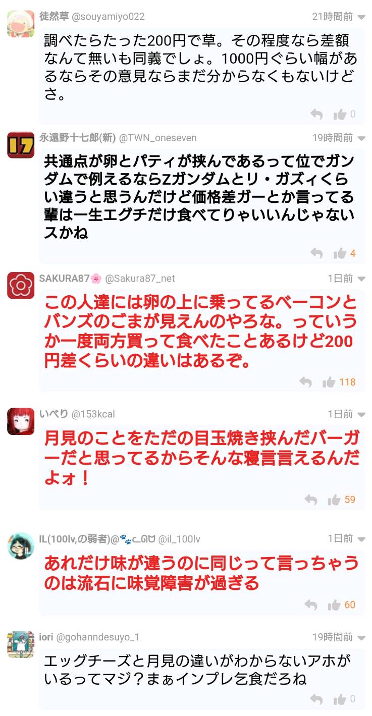 まあエグチと月見食べ比べて全く同じとか言ってる奴は逆に幸せやと思うわ