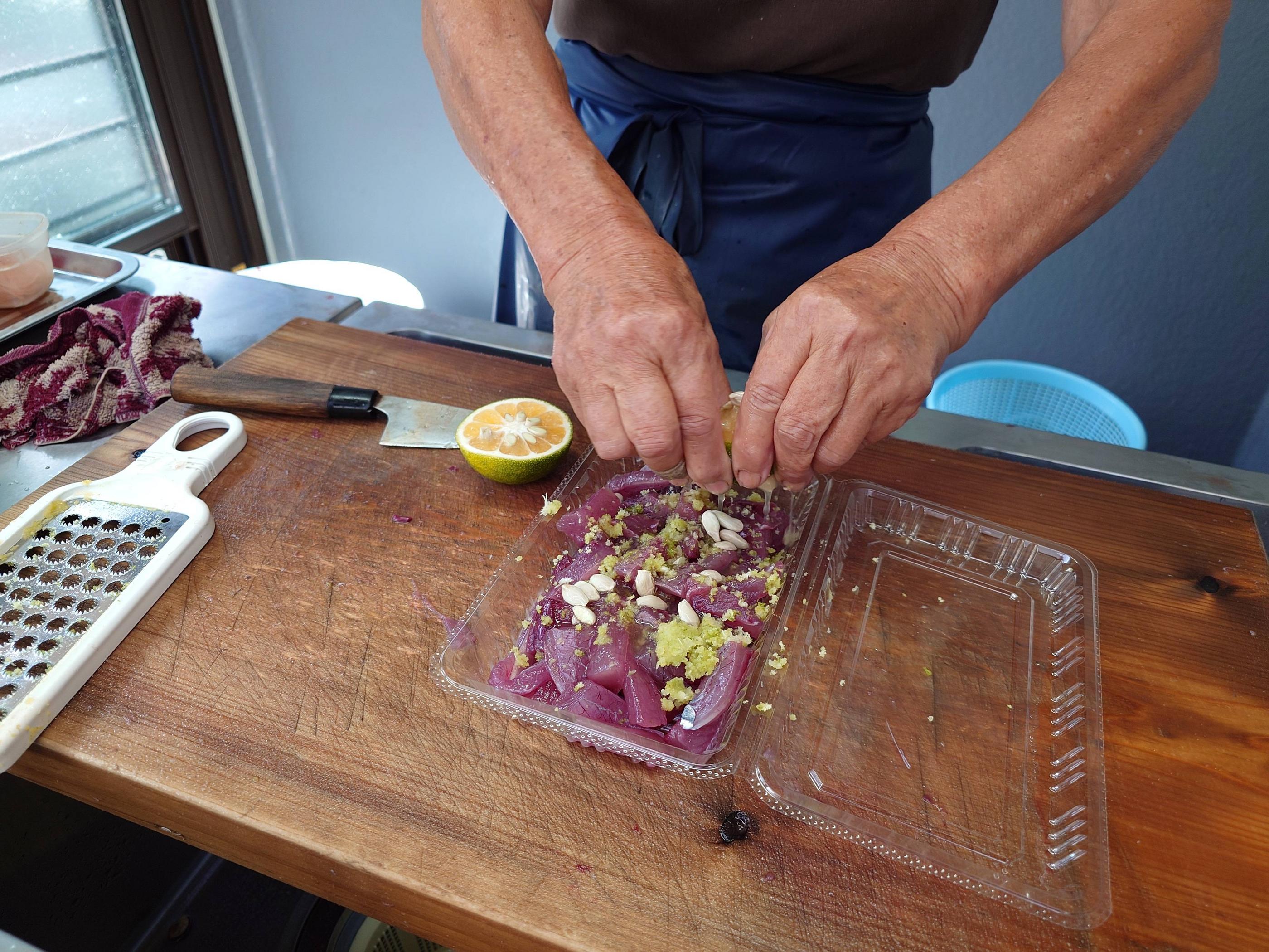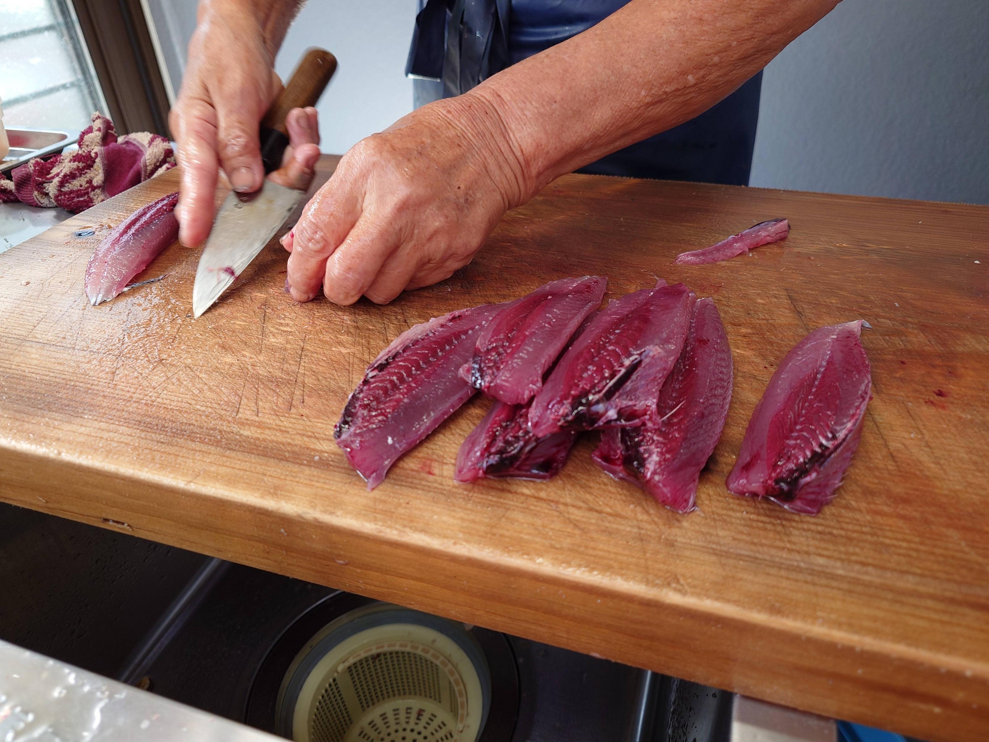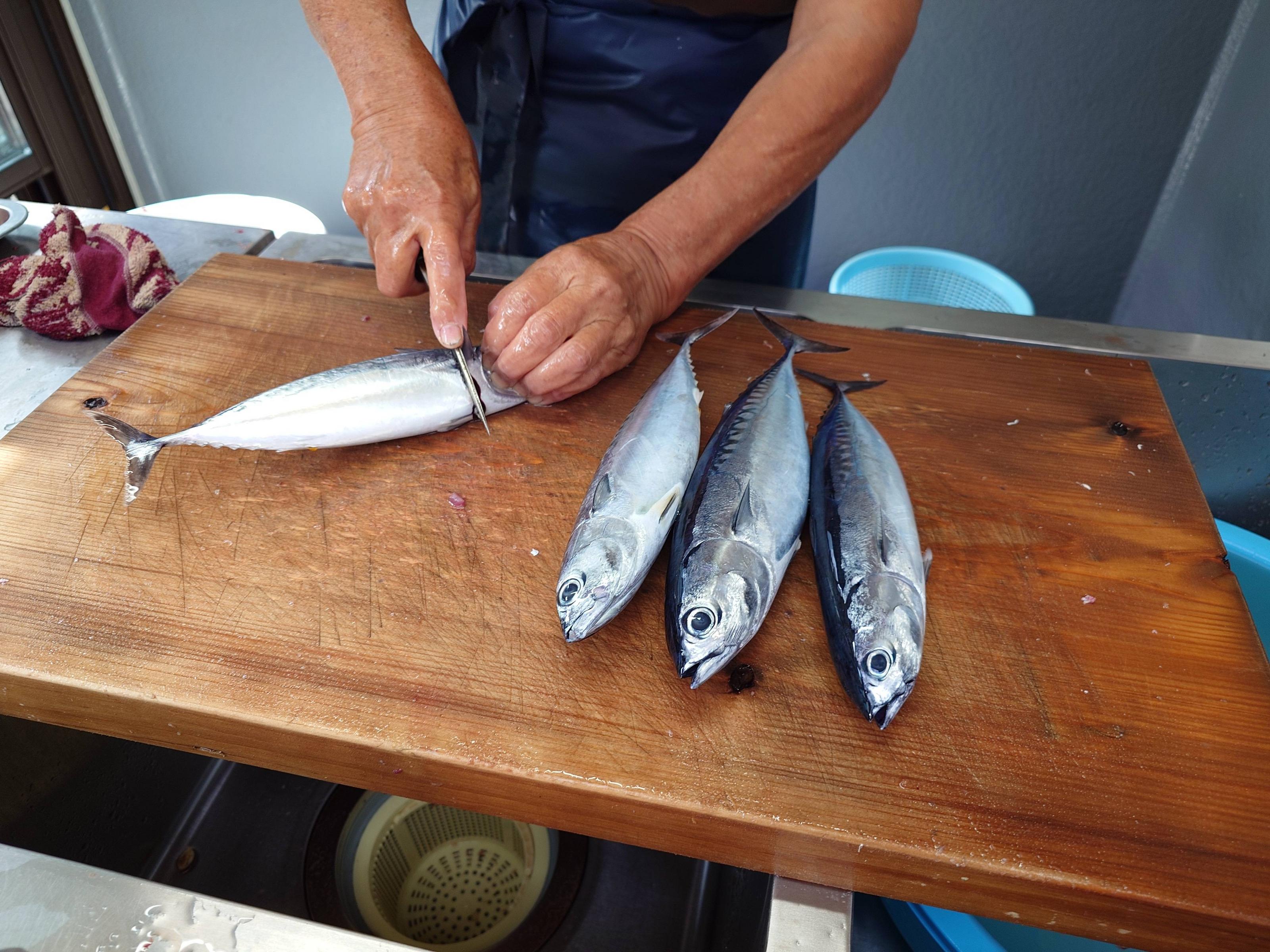 鮮やかな包丁捌きで四匹のメジカが捌かれていく