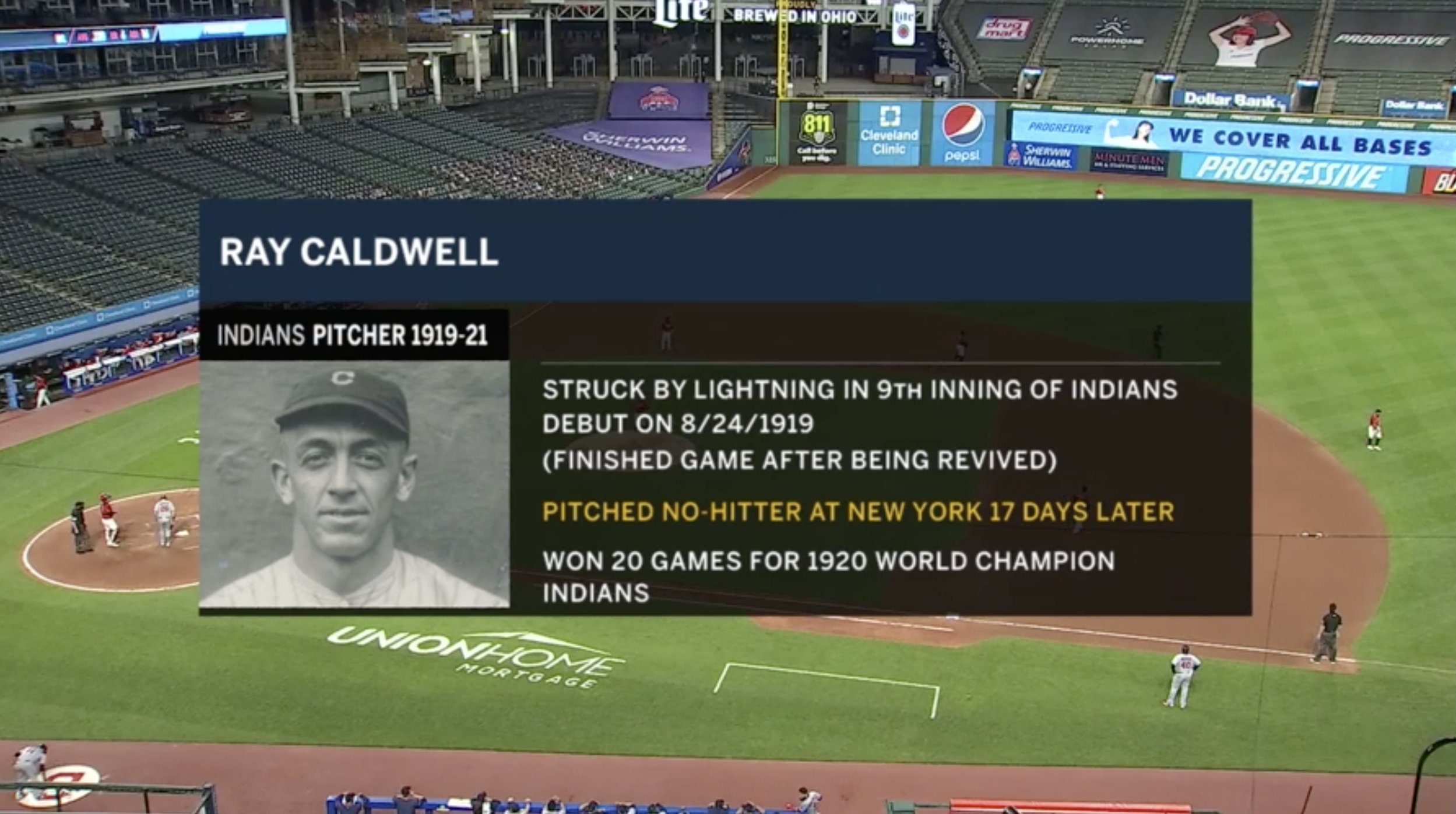 ・1919年8月24日、9回残り1アウトのところで雷に打たれて心停止