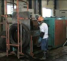 こんな感じで作業しててすぐ後ろに廃棄タイヤが並べてあるんや