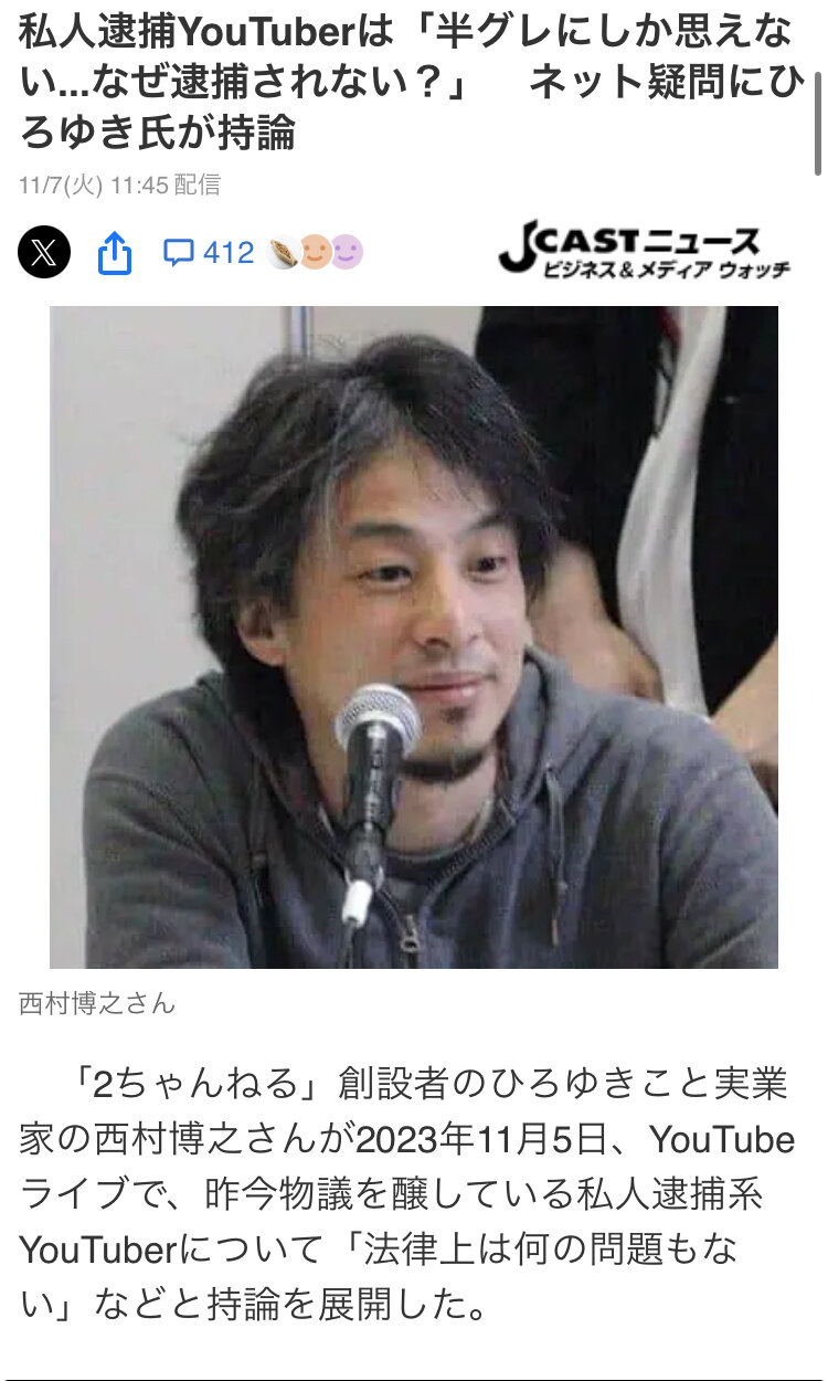 コロアキが先例を作ったことで私人逮捕系Youtuberを逮捕するYoutuberが現れそうだな
