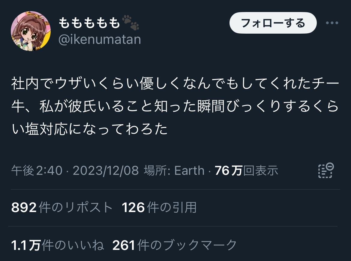 社内でウザいくらい優しくなんでもしてくれたチー牛、私が彼氏いること知った瞬間びっくりするくらい塩対応になってわろた