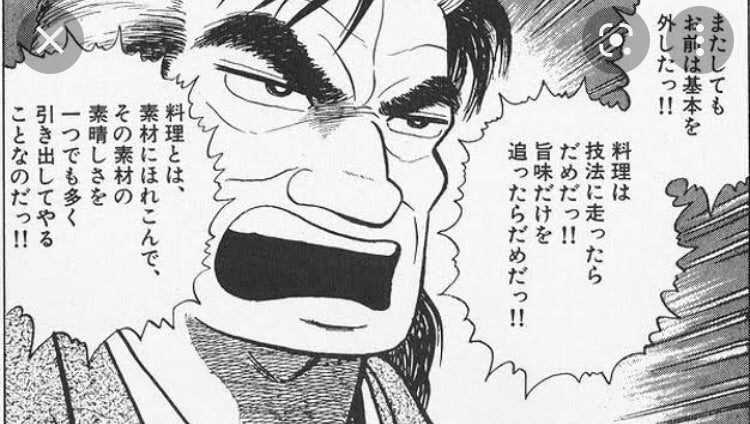 海原雄山「料理は食材から作品を生み出す芸術だ!技巧に走りすぎてはダメだが技巧なくして芸術は存在しない!」