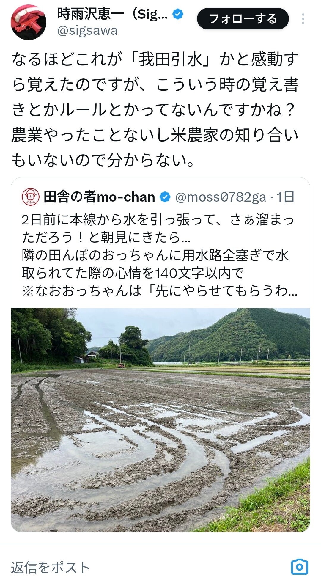 Xで田植え準備で水入れようとしたら隣のジジイに水取られたってのが話題になってるがその逆か