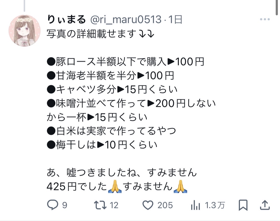 こいつとかもそうやけど実際店と同じもの食おうとすると普通にそれなりの値段になるから嘘松するしかなくなるんよな