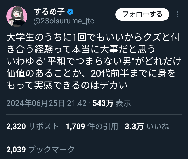 自分だけマンコ特権使って色んな男とお遊び恋愛しておいて最後だけ俺らみたいなフツメンの小金持ち選んで妥協寄生するんだから、昆虫的、生理的な狡猾さを感じてならない