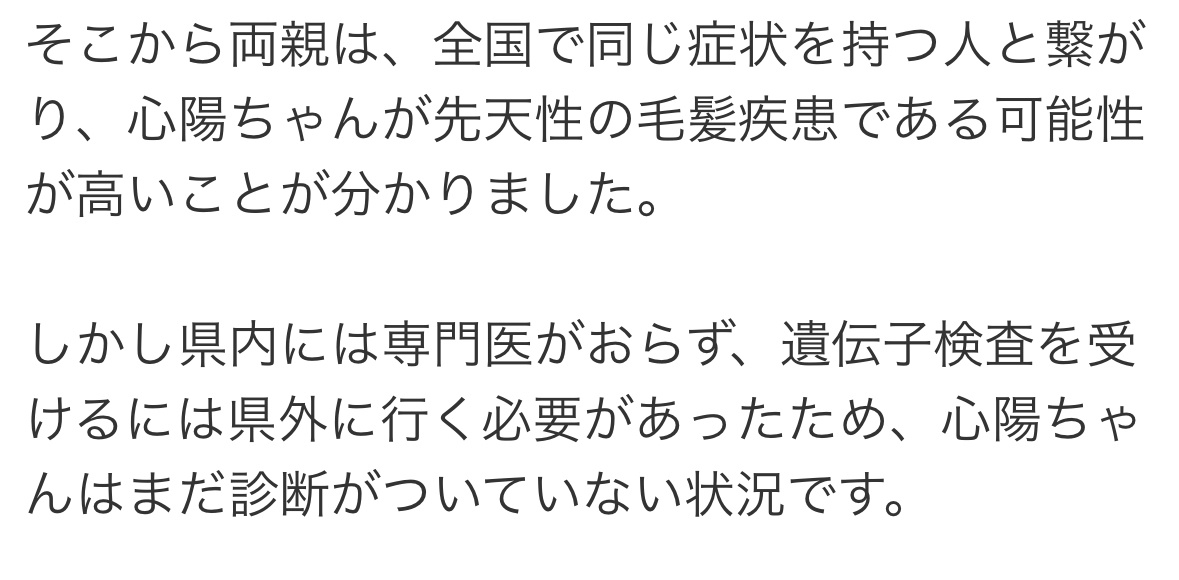 歌とダンスが得意で、おしゃれが大好きな心陽ちゃん。生まれつき、髪がまばらにしか生えず縮れてしまうという悩みを抱えています。