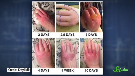 まず、皮膚が赤く腫れ上がり、痒みを引き起こし、48時間以内に水疱を生じさせる