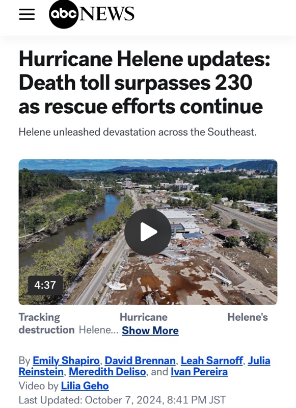 9月26日から27日にかけて米国に上陸したヘレンは、フロリダ州やノースカロライナ州を含む南東部の6州で、暴風や洪水による甚大な被害をもたらした。CNNによると、死者数は230万人を超えているという。