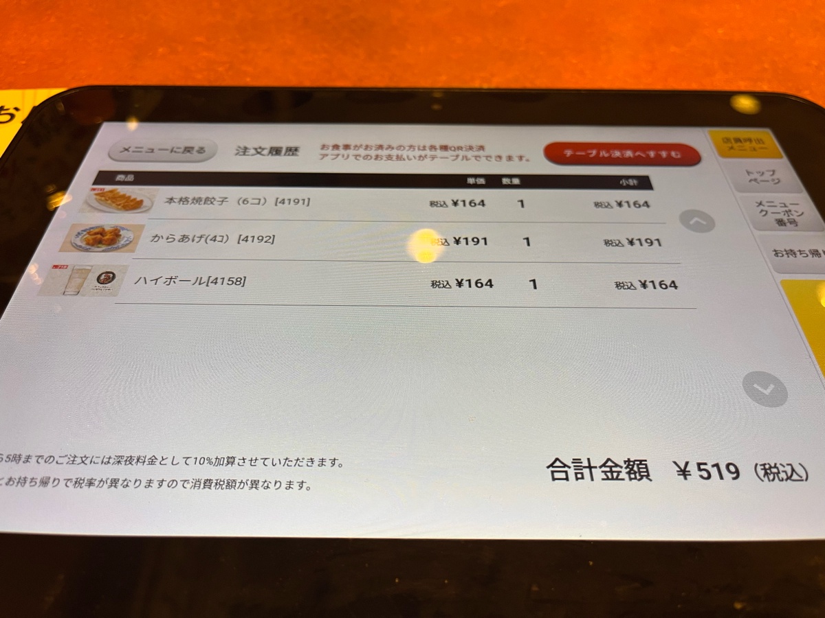ハイボール、唐揚げ、餃子を頼んで519円