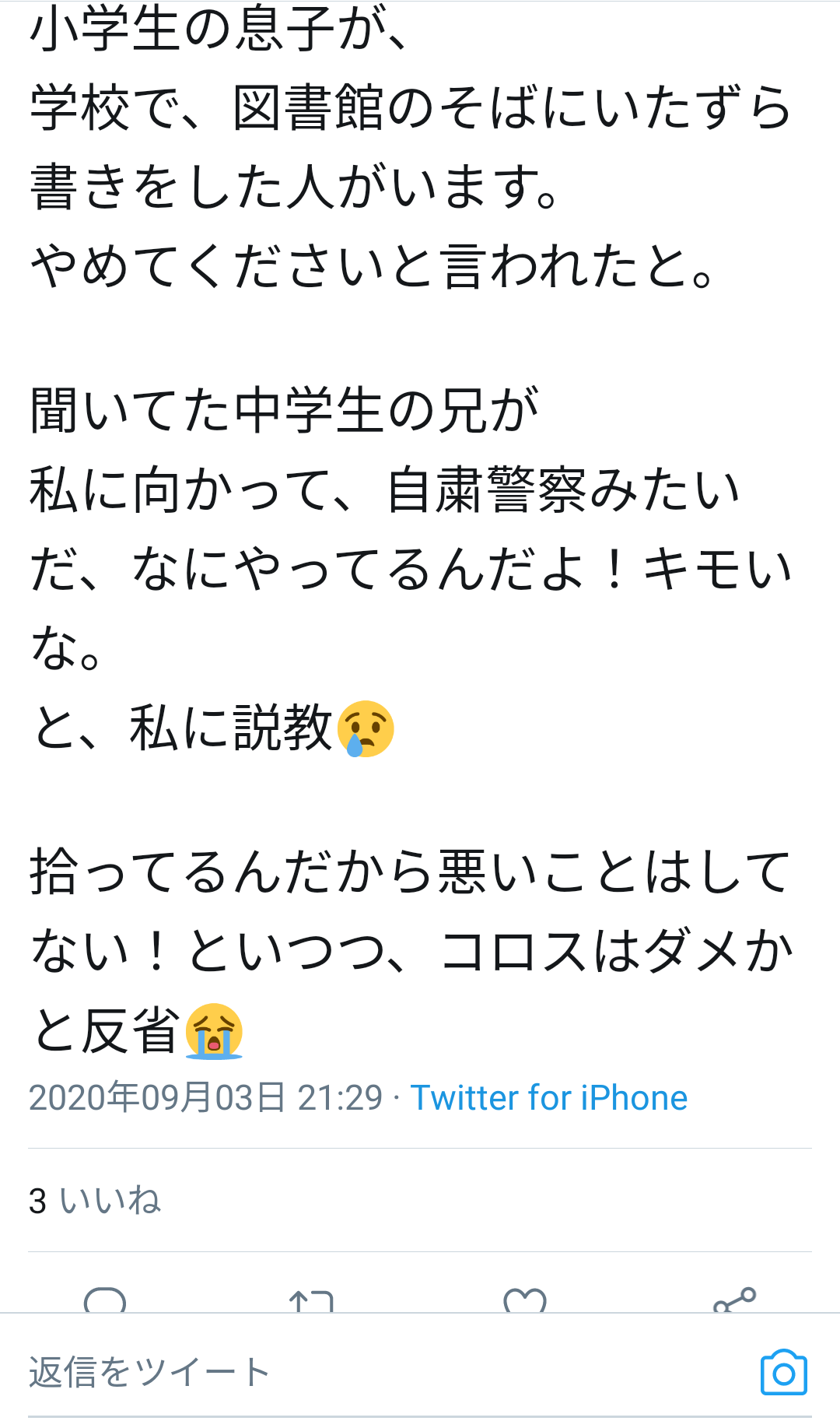 息子たちに過激なメッセージのことを窘められて反省する→