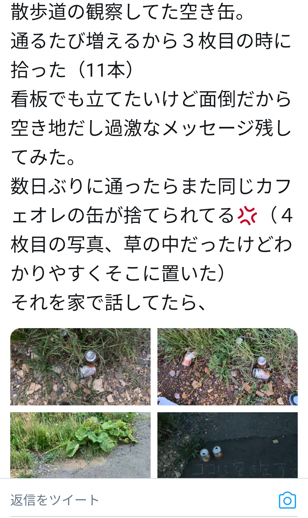 空き缶拾った後でも相変わらず捨てられてることに腹を立て過激なメッセージを書き残す母親→