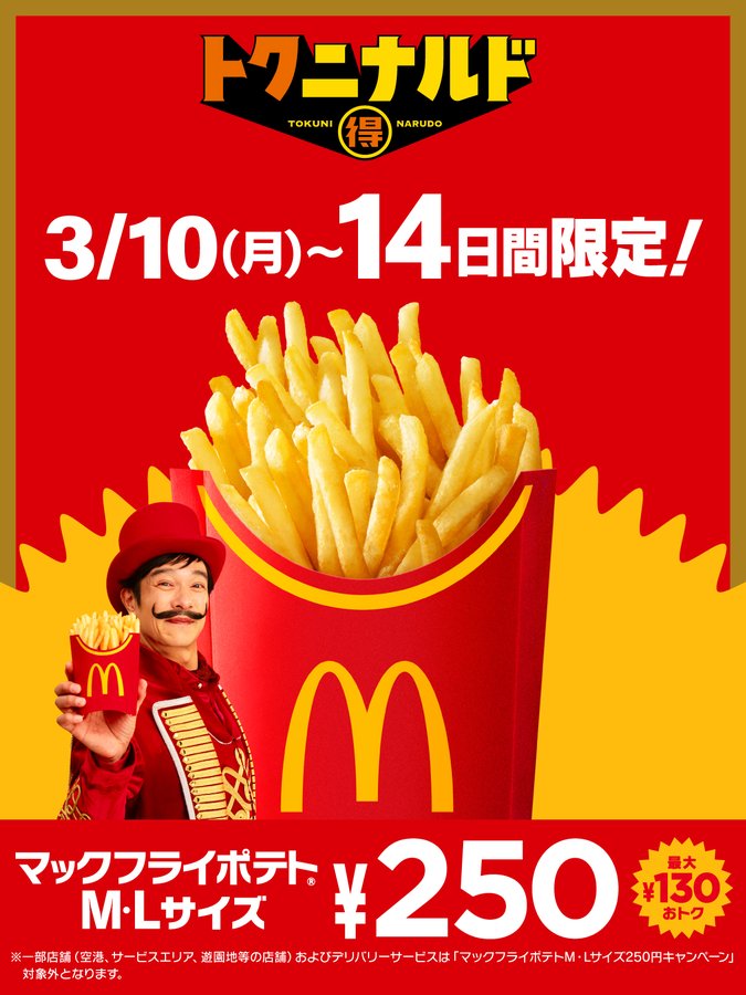 来週3/10(月)から、2週間ポテトM・L250円、はじまる!!!! #トクニナルド pic.twitter.com/uCVq09nETl