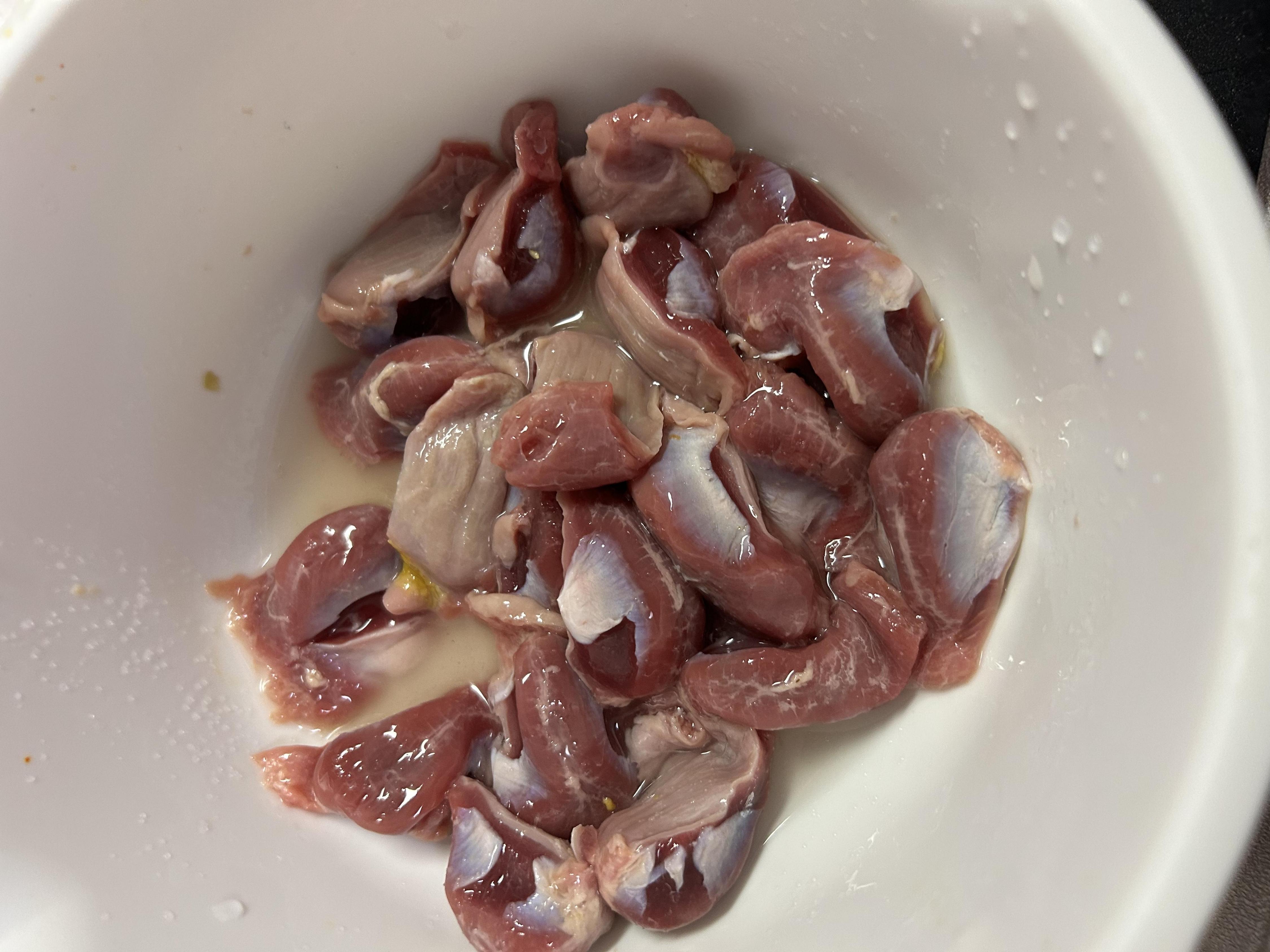 砂肝は銀皮取ってもいいんですけどゴリゴリがいいので軽く切込みを切れるだけで処理して、脂や汚いところを上の塩酒で洗います