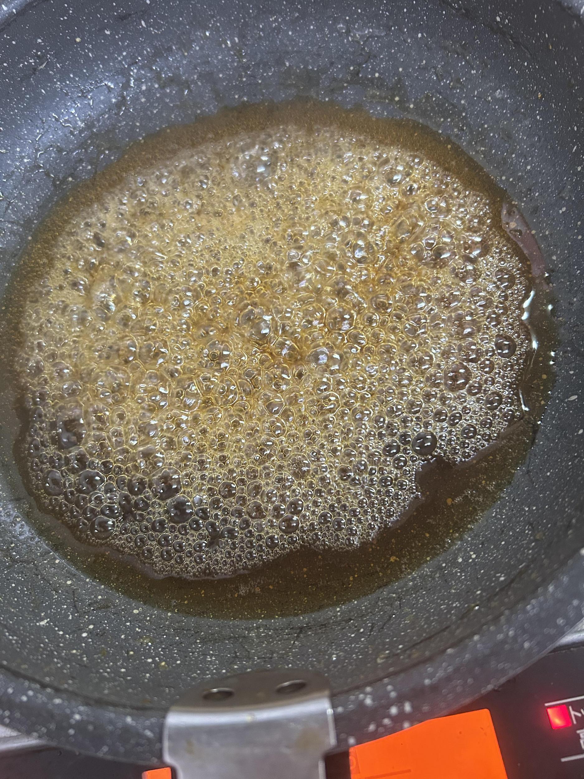 カラメルを作り、出来たら味醂を入れます