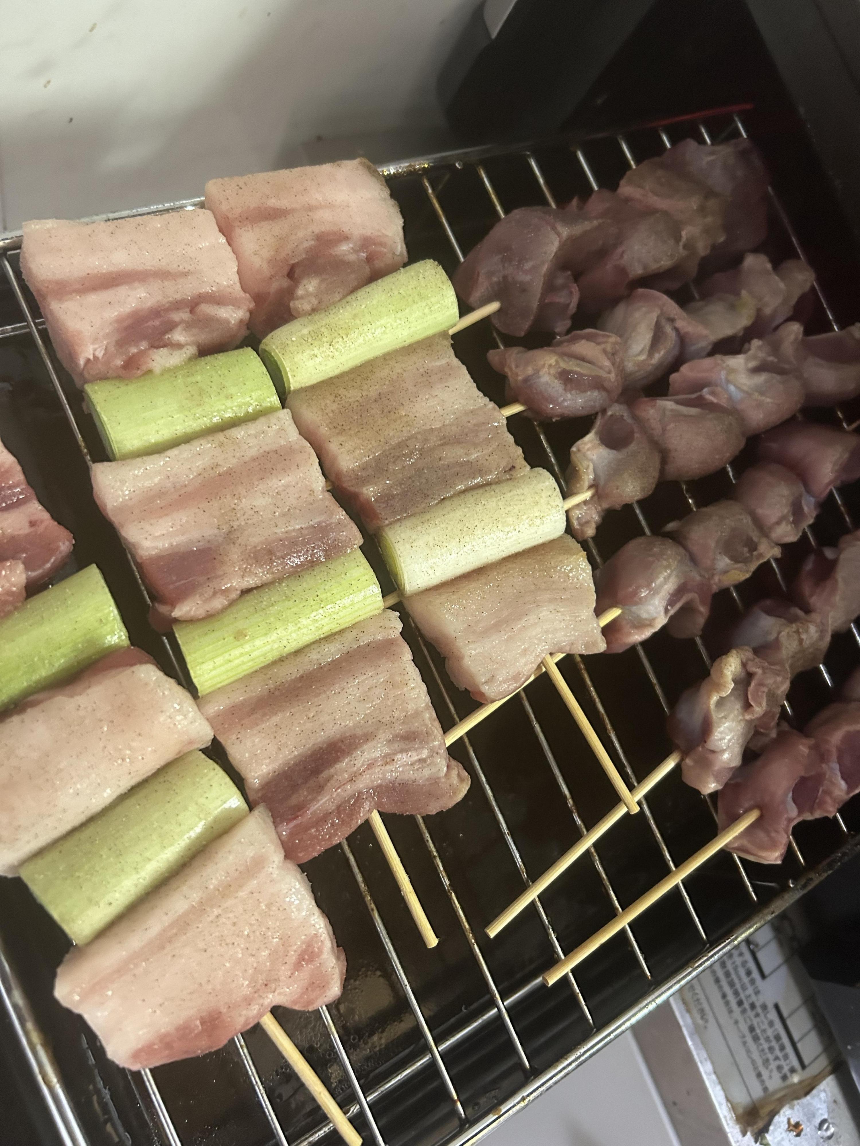 豚肉、鶏肉、ネギを適当に切って串に打ちます