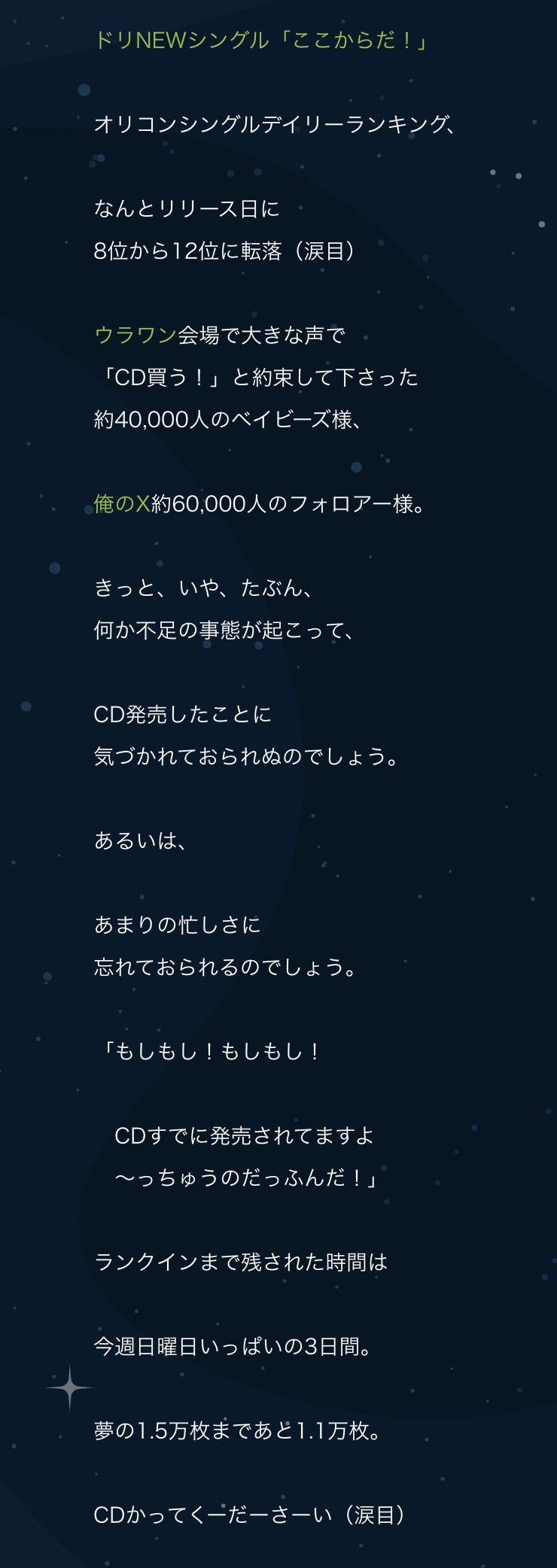中村は、12日に発売された同シングルについて「オリコンシングルデイリーランキング、なんとリリース日に8位から12位に転落(涙目)」と報告。ファンや自身のX(旧ツイッター)フォロワーらについて「きっと、いや、たぶん、何か不足の事態が起こって、CD発売したことに気づかれておられぬのでしょう。あるいは、あまりの忙しさに忘れておられるのでしょう」と推察した。