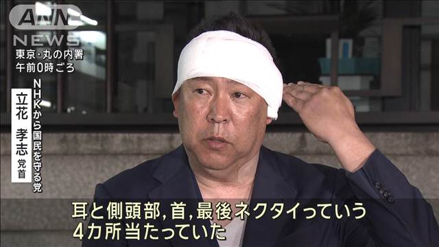 東京・霞が関で政治団体「NHKから国民を守る党」の立花孝志党首(57)が襲われ負傷した事件を巡り、警視庁は4日、周囲の人が現場で取り押さえた容疑者の男を、駆け付けた丸の内署の警備課長ら4人が速やかに確保すべきだったとして、署幹部を指導したと明らかにした。