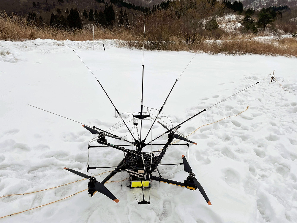 機体から伸ばした金属製ワイヤを地面に接地したところ