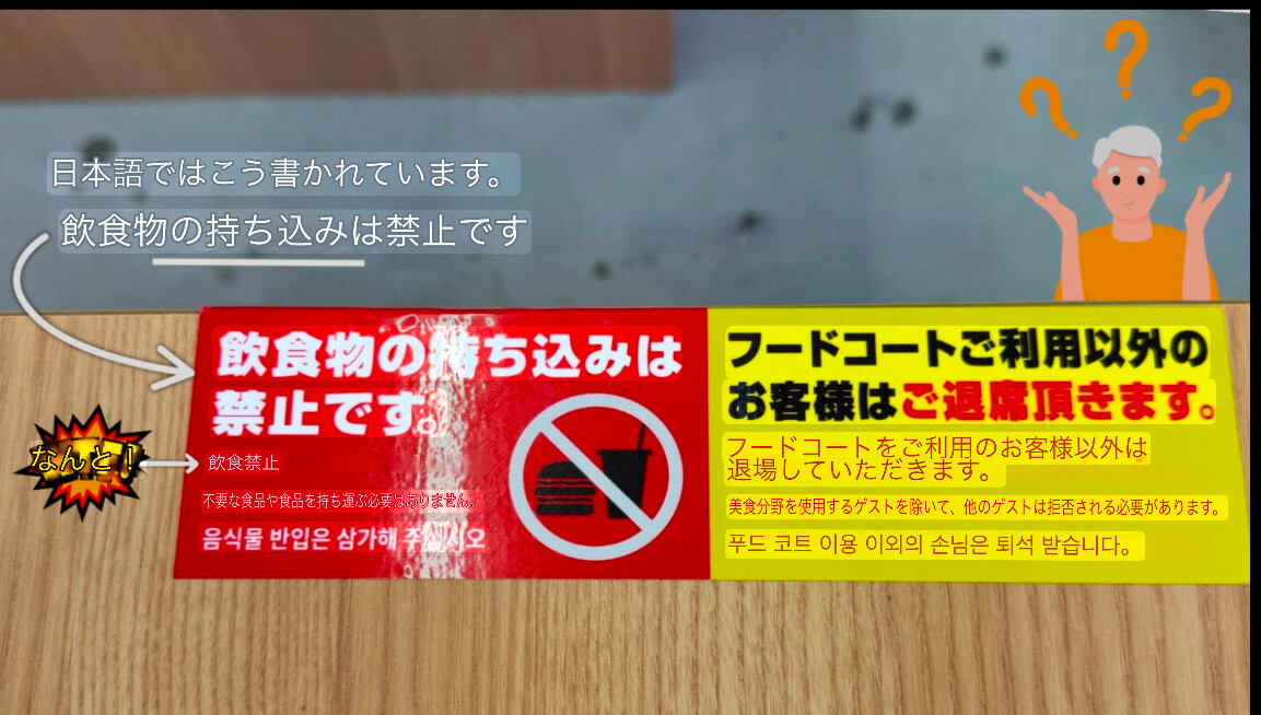 →右の黄色のシールには英語で「フードコートをご利用のお客様以外は退場していただきます」と書かれている。