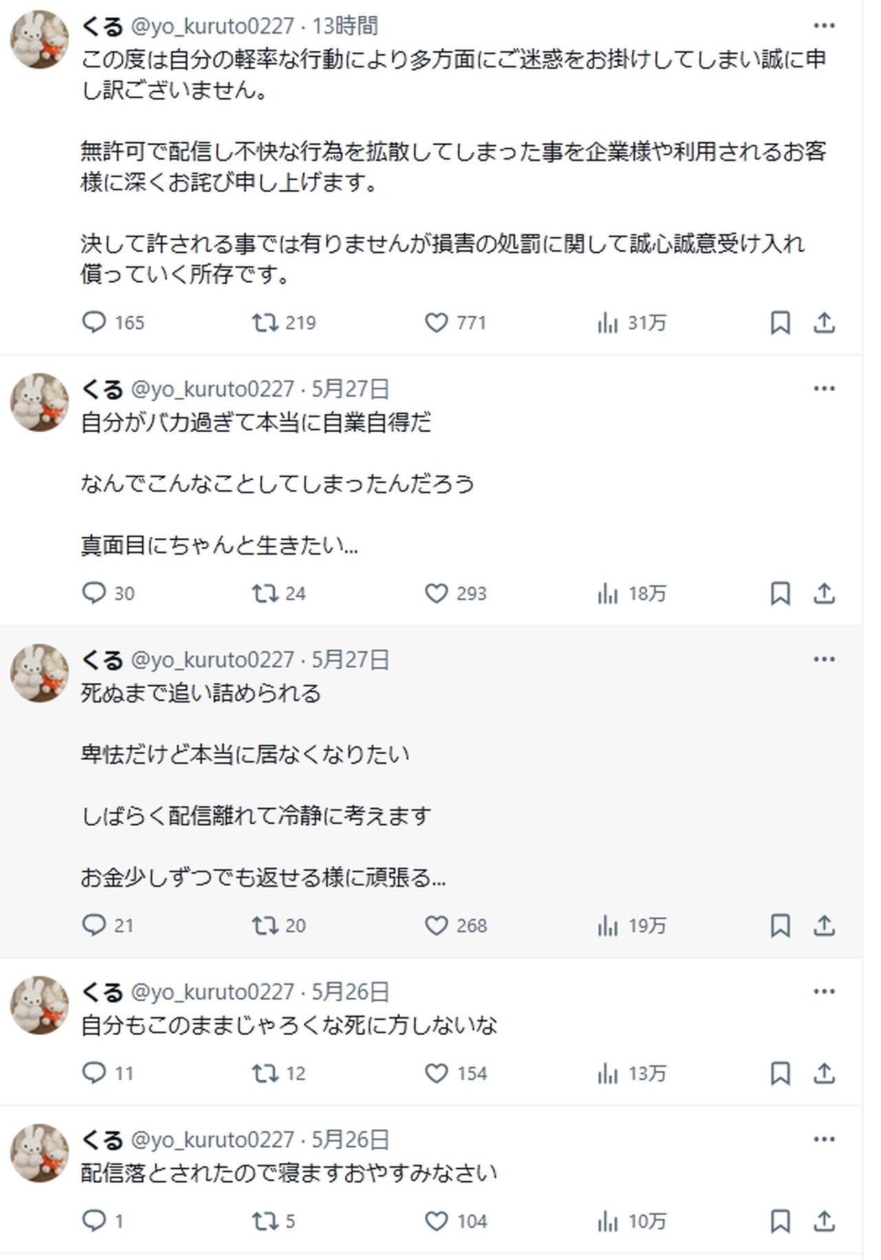 配信者ってメンヘラが構って欲しくて過激なことやりやすい環境だよな