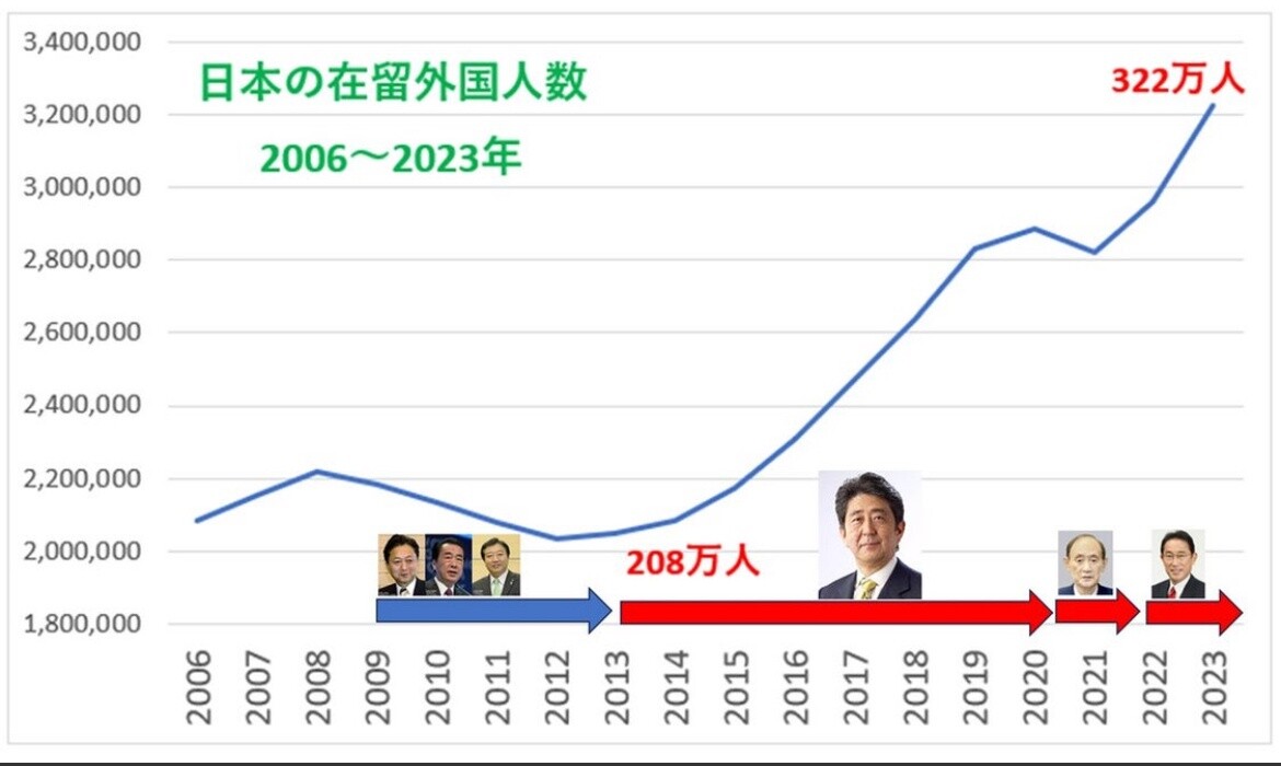 これ見るとわかるけど民主党政権で外国人受け入れ体制作ったことで次の安倍政権で増えてる