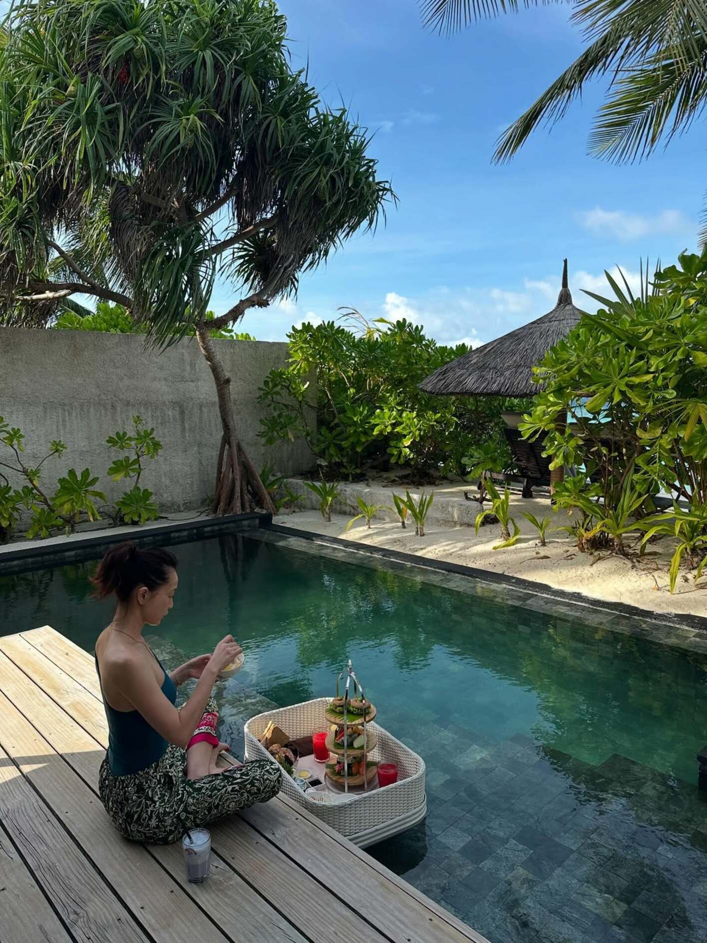 青空の下、プールの前にあぐらをかき、姿勢よく座る長谷川さん。プールにはデザートのようなものが入ったボックスがプカプカと浮いていて、アフタヌーンティーを楽しんでいるようです。