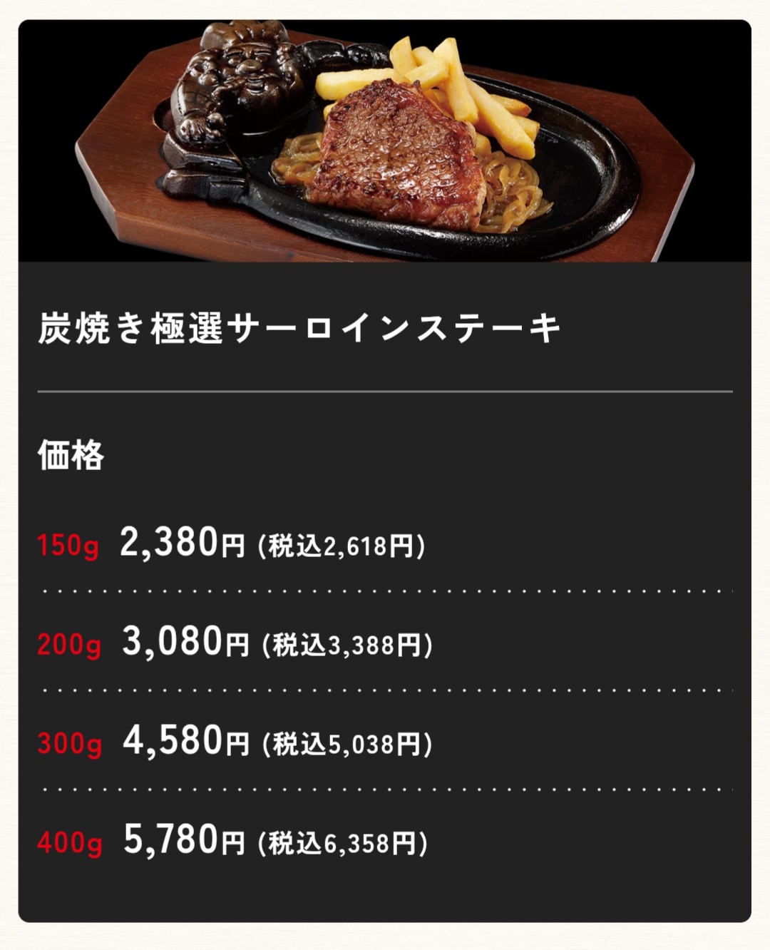 意外とサーロインで450gならステーキ専門のファミレスよりちょいお高い位やろ