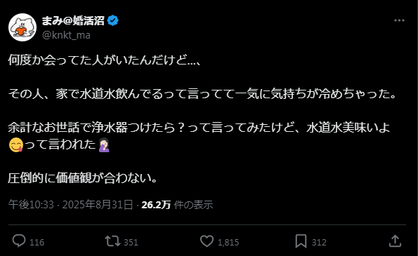 男(都内住み、新築クワマン)水道水うまいよ