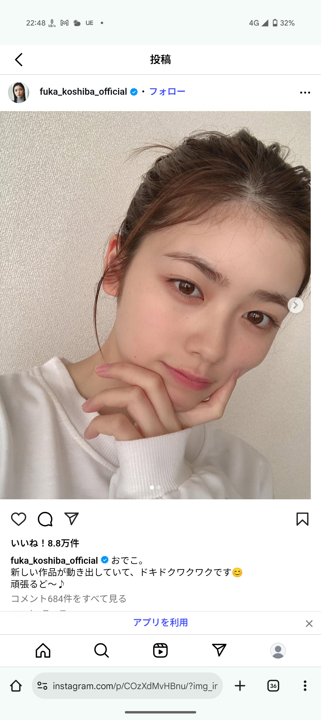 小芝風花「すっぴんで失礼します」 パシャッ