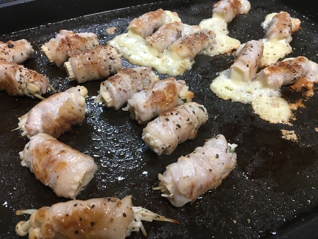 豚バラでエノキを巻いたものとチーズを巻いたもの
