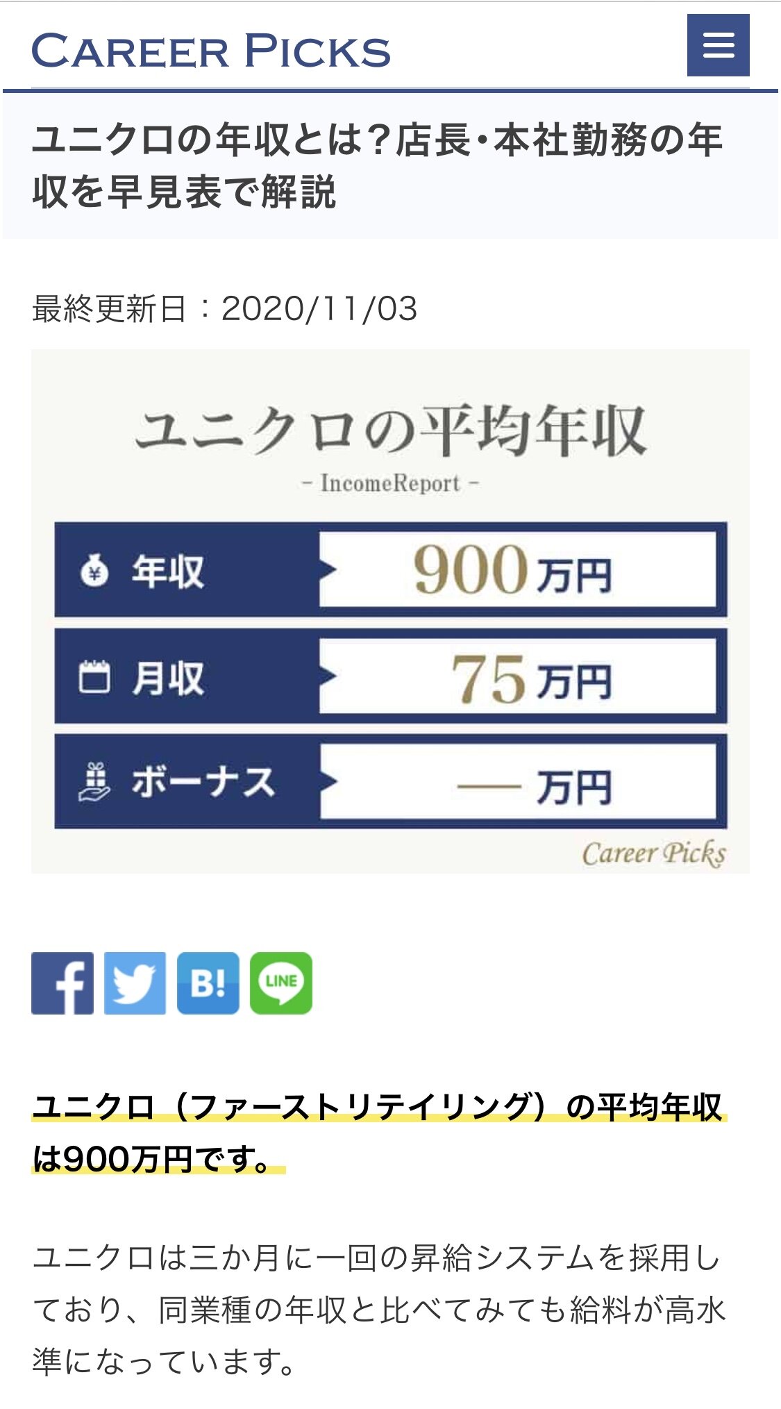 ユニクロ店長の年収は約548万円~818万円って書いてたぞ