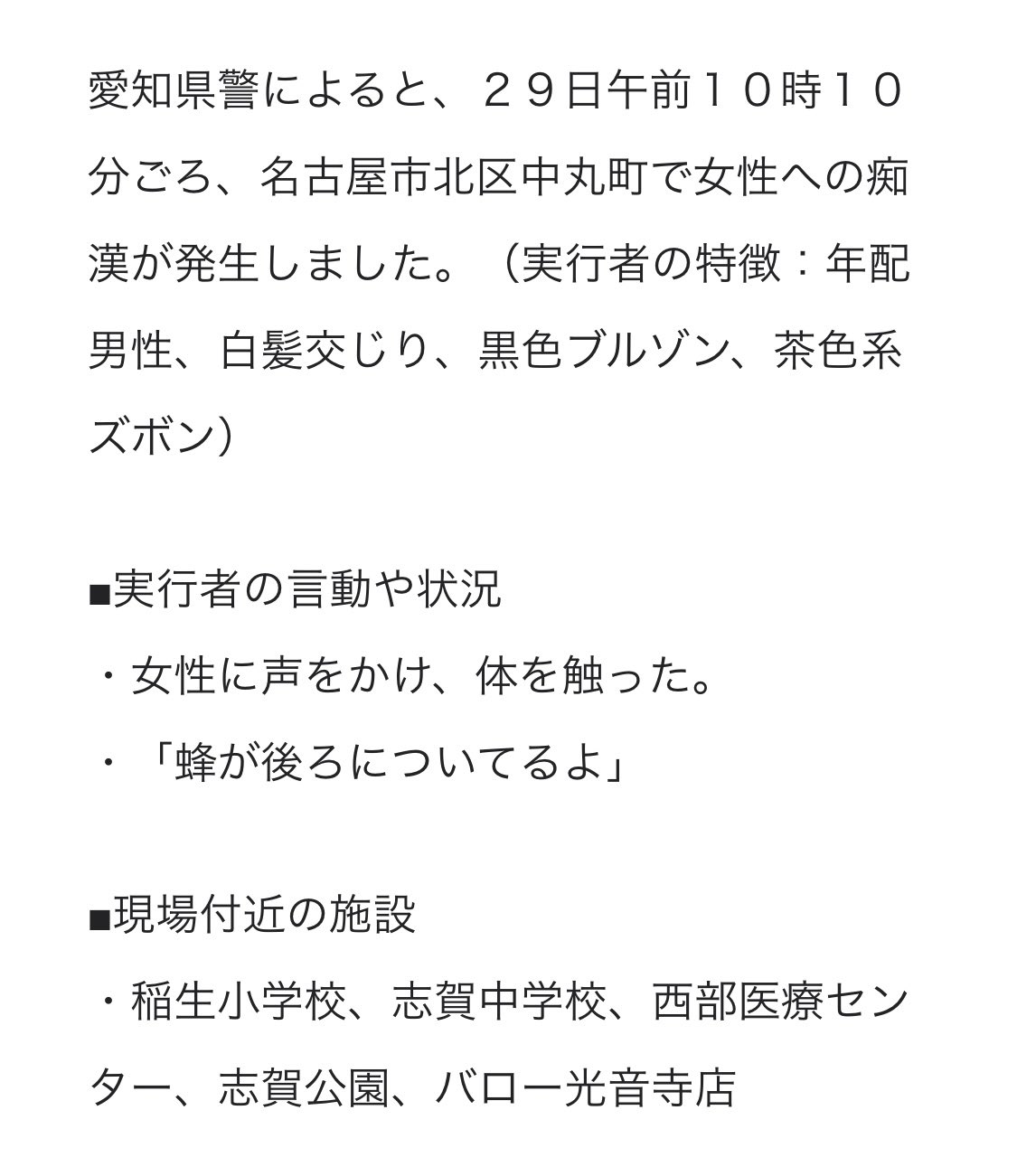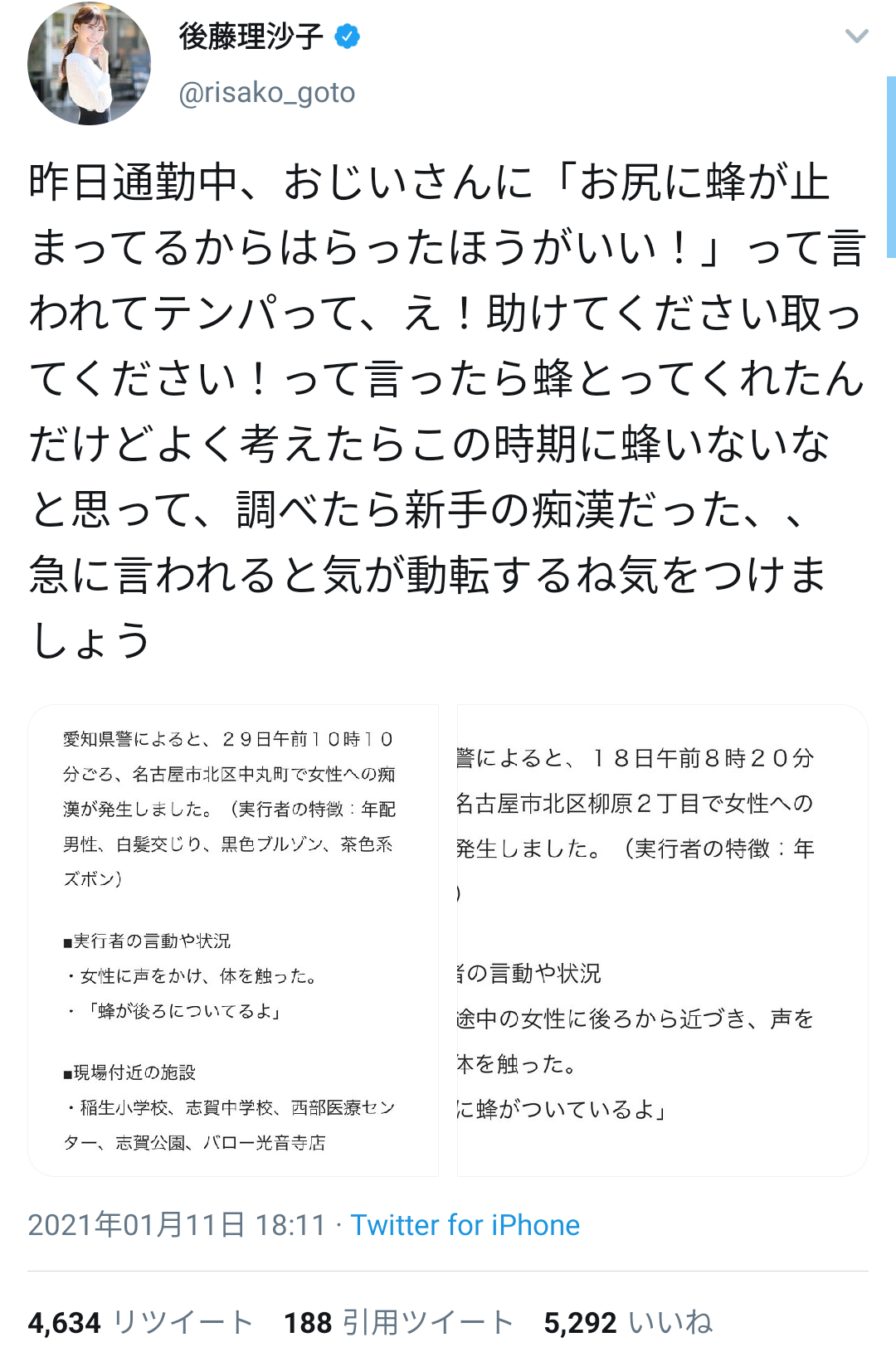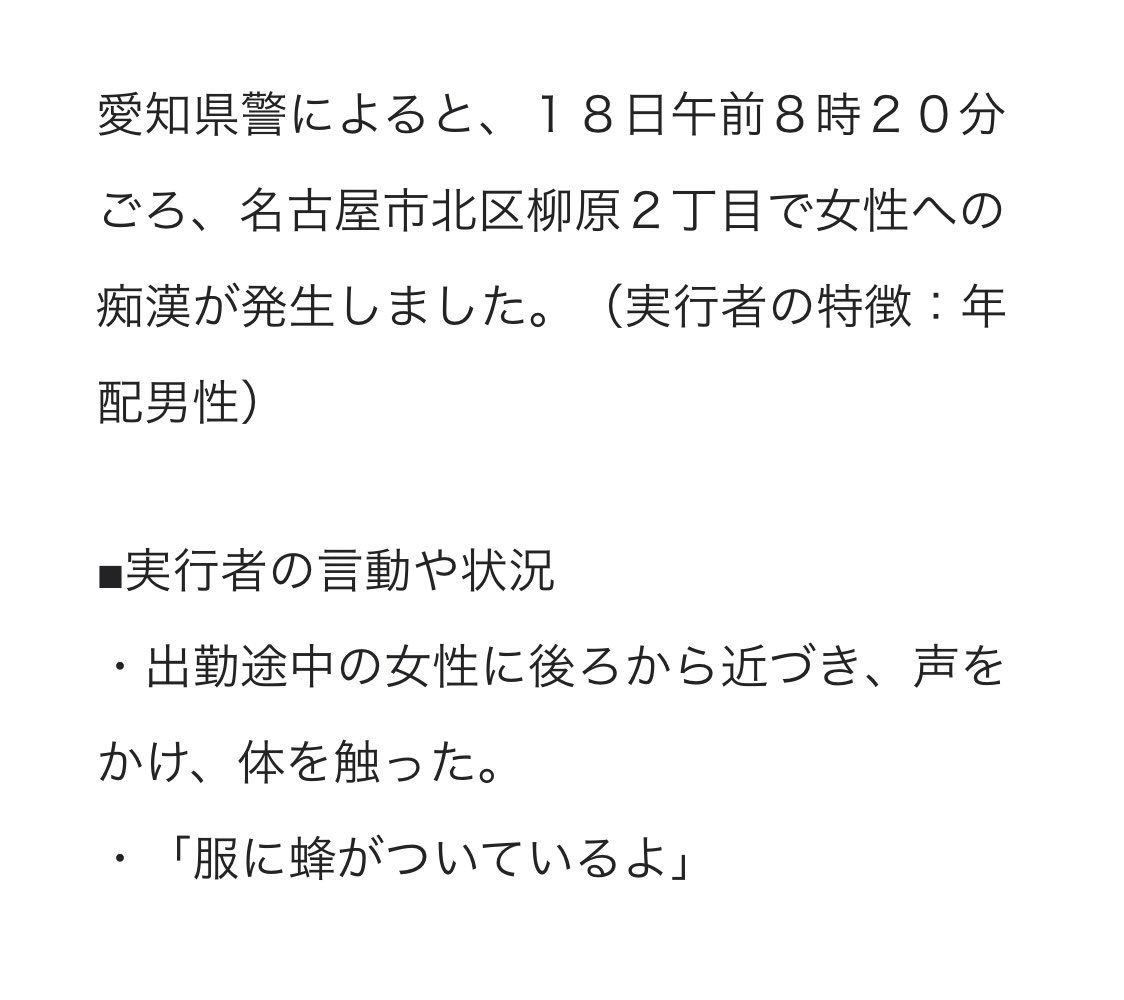 昨日通勤中、おじいさんに「お尻に蜂が止まってるからはらったほうがいい!」って言われてテンパって、え!助けてください取ってください!って言ったら蜂とってくれたんだけどよく考えたらこの時期に蜂いないなと思って、調べたら新手の痴漢だった、、急に言われると気が動転するね気をつけましょう