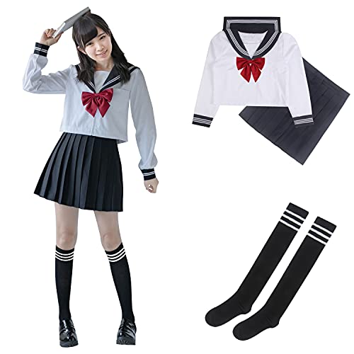 DERAYEE セーラー服 コスプレ 長袖 女子高生 4点セット 制服スカート 学生服 仮装 JK 赤いリボン スカート ストッキング 白 紺(XL)