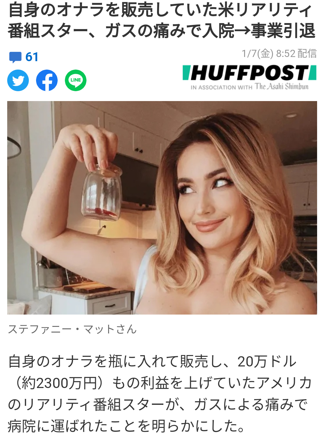 >しかし、大量のオナラを排出するための生活は、体に負担がかかっていたようだ。1日に3杯のプロテインシェイクと大量の黒豆スープを飲んでいた彼女の体は、代償を払うこととなった。