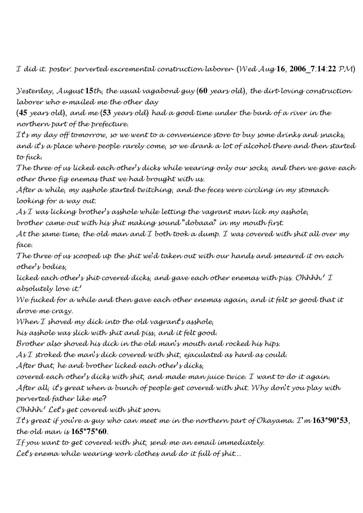 昨日の8月15日にいつもの浮浪者のおっさん(60歳)と先日メールくれた████の土方のにいちゃん