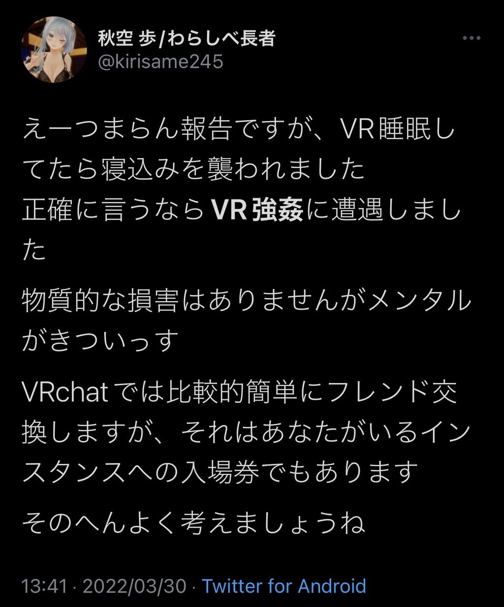 VR強姦ってのはVR睡眠してる間にアバターにセクハラ行為することや