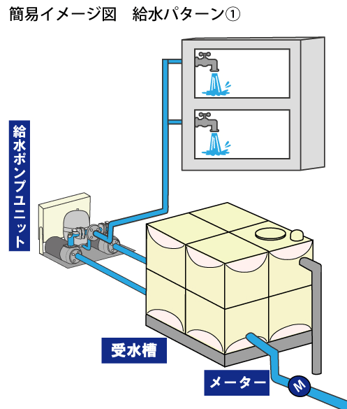 上層階では水道の圧力が低くなるからポンプで屋上の貯水槽に送ってから各部屋に繋がってる