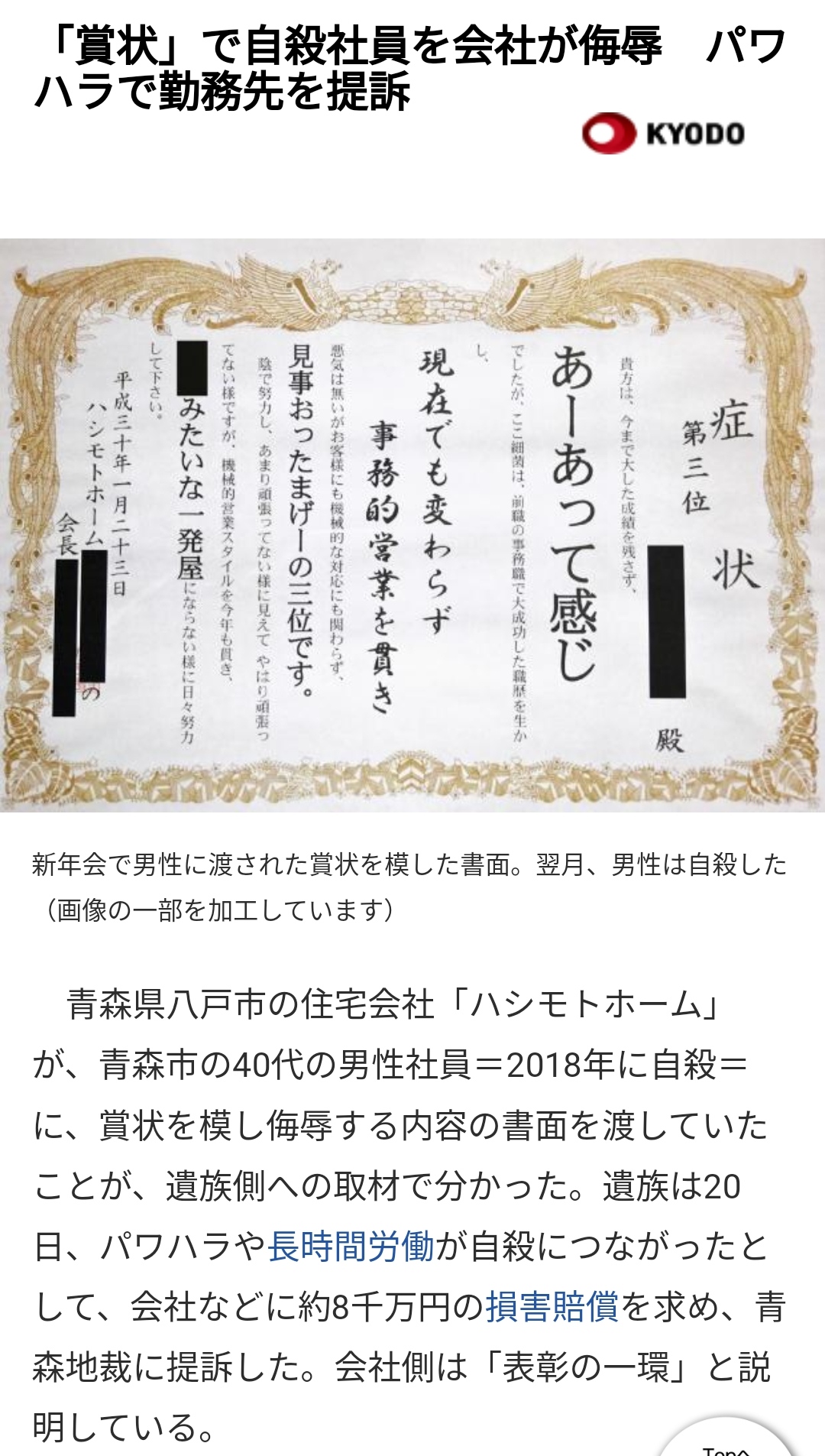青森県八戸市の住宅会社「ハシモトホーム」が、青森市の40代の男性社員=2018年に自殺=に、賞状を模し侮辱する内容の書面を渡していたことが、遺族側への取材で分かった。
