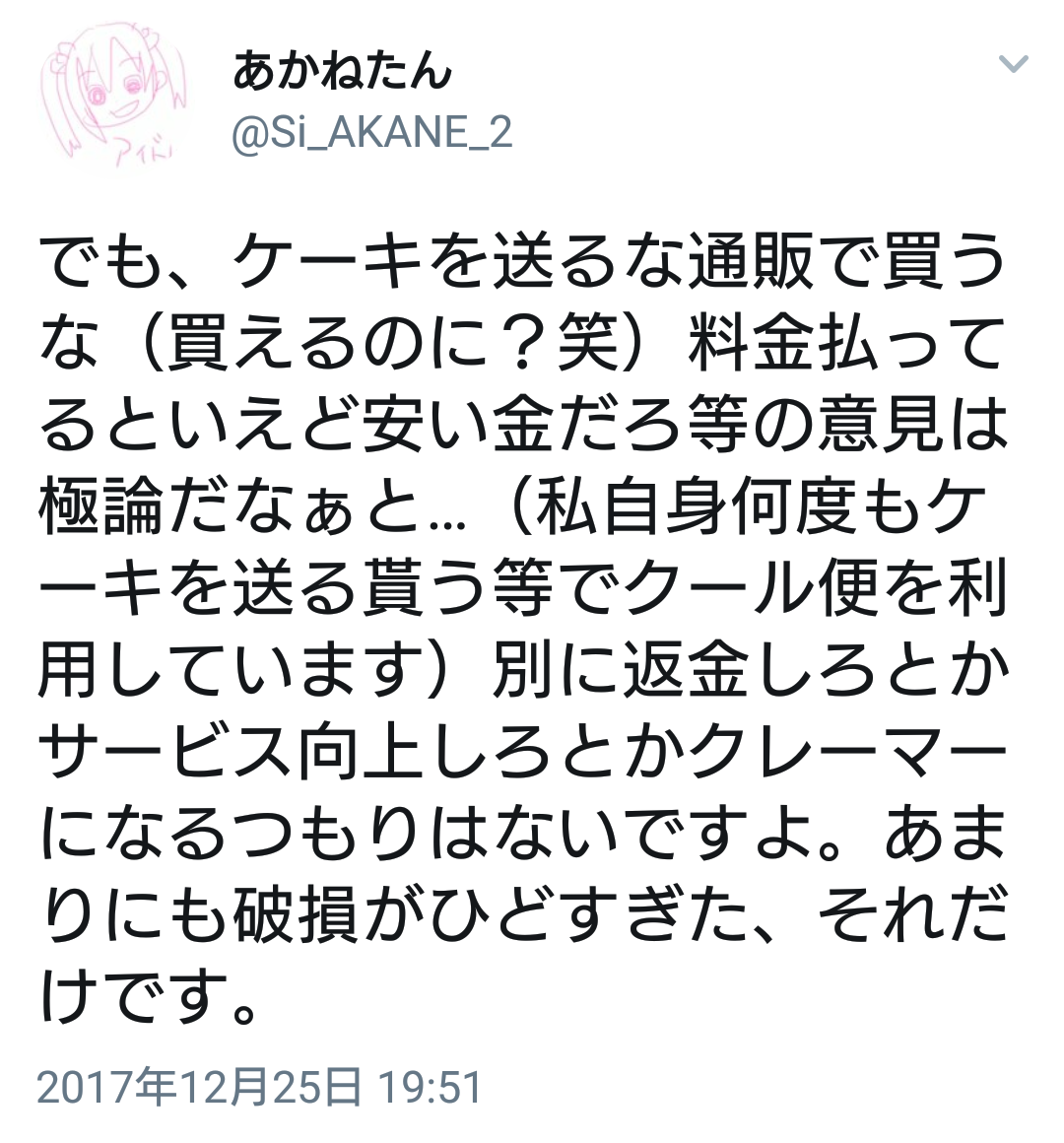ヤマト運輸ではクール便でのケーキの郵送は拒否していると指摘されて逆ギレ