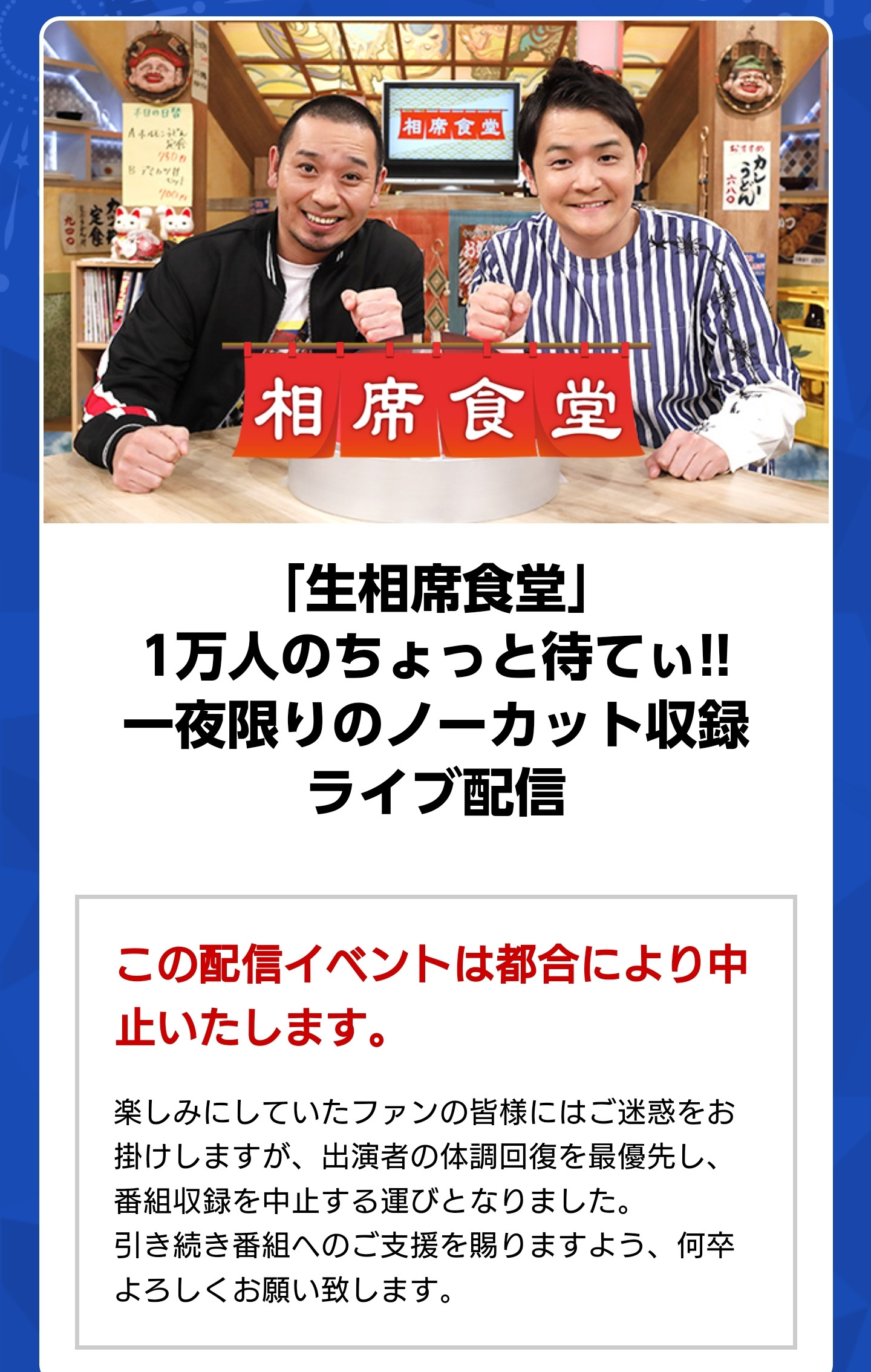 明後日に相席食堂公開収録配信あるけど大悟一人でやるんか