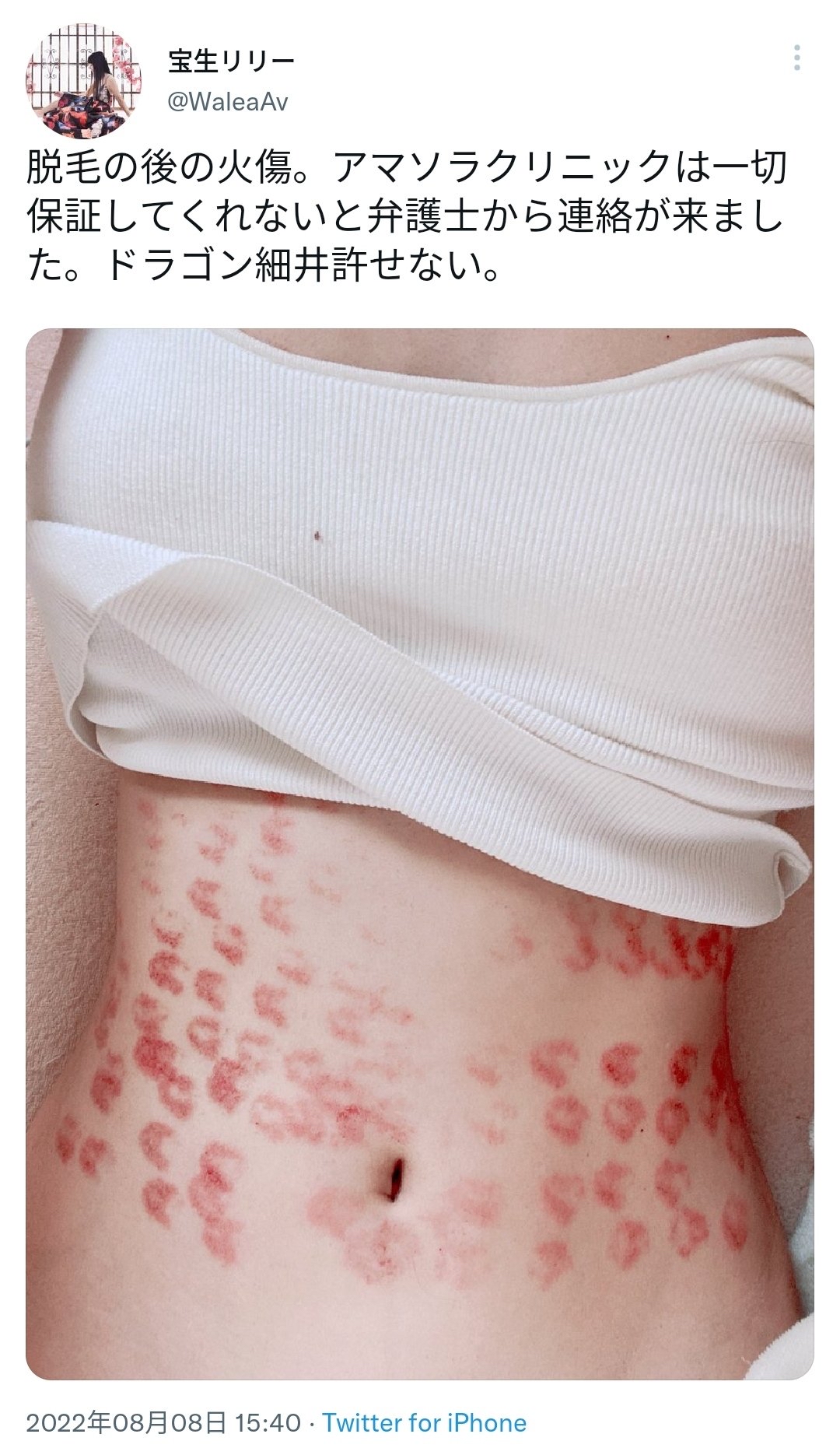 脱毛の後の火傷。アマソラクリニックは一切保証してくれないと弁護士から連絡が来ました。ドラゴン細井許せない。 pic.twitter.com/D6SzcLabww