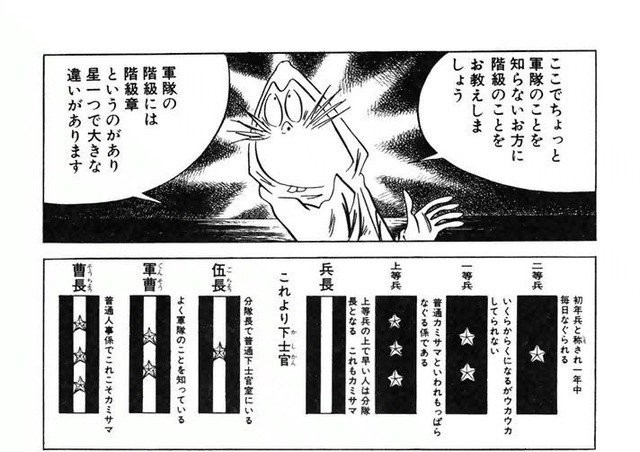 水木しげる「軍の階級説明するで!上等兵はめっちゃ偉くて殴る人!兵長はそれよりもっと偉いカミサマや!」