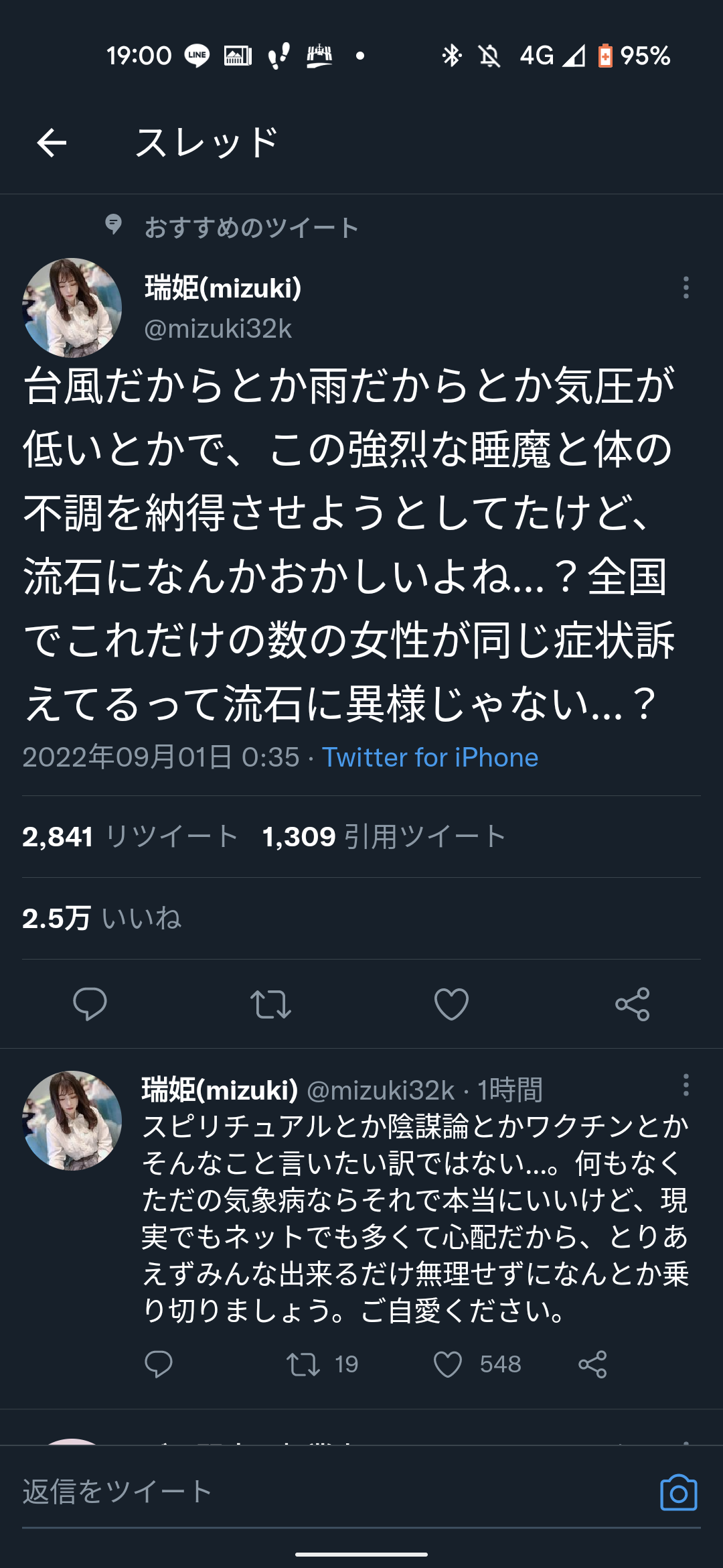 台風だからとか雨だからとか気圧が低いとかで、この強烈な睡魔と体の不調を納得させようとしてたけど、流石になんかおかしいよね...?全国でこれだけの数の女性が同じ症状訴えてるって流石に異様じゃない...?