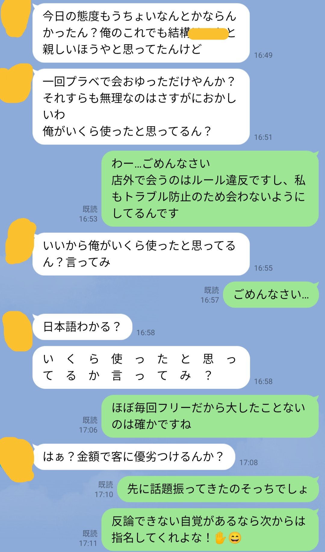 Twitterで #クソ客のいる生活 ってタグ漁るの好きなんやけど、このLINEしてる嬢は断トツで気が強くて見応えあるわ