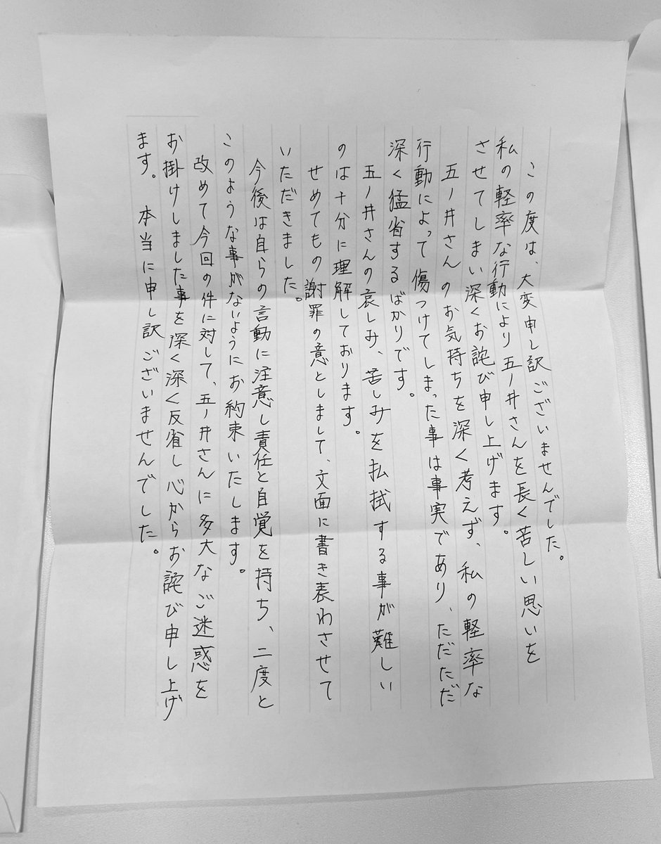 本日、やっとの思いで加害者4名から直接、謝罪と手紙を受けました。個別で一人ずつ対面し、しっかり本人達が事実を認め謝罪。私は今まで加害者からの直接謝罪を目的として活動してきたので、対面は怖くありませんでした。一年が過ぎ本当に遅い謝罪でしたが、ようやく実現しました。(続) pic.twitter.com/mw3upfkn2Y