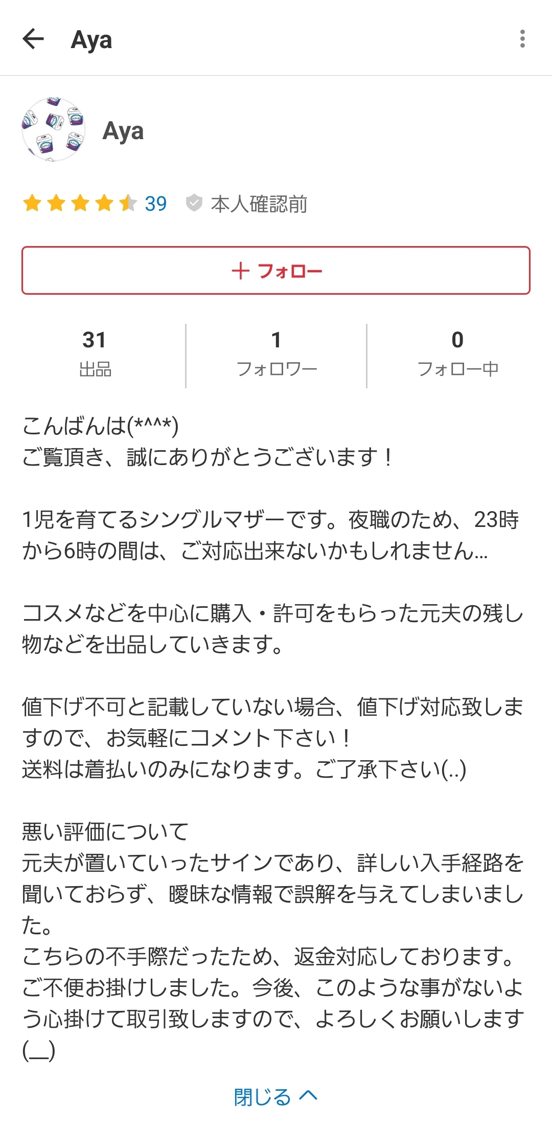 なお出品者はシンママ